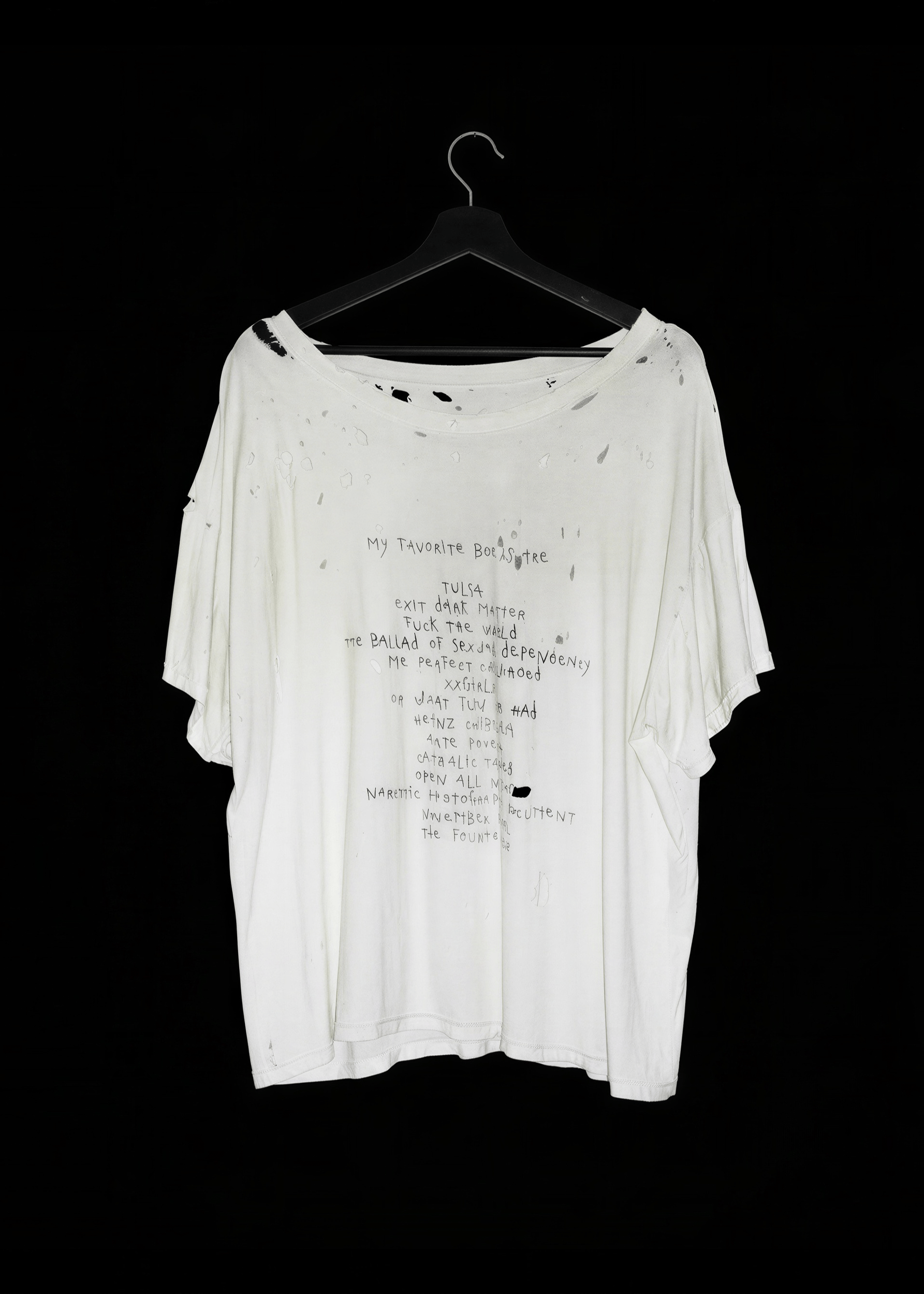 A raw, deconstructed statement piece. This oversized, heavily distressed white T-shirt features hand-scrawled text listing cult-favorite books, merging literature and subversive fashion. With a relaxed, draped fit and intentional distressing throughout, it embodies a worn-in, rebellious aesthetic.